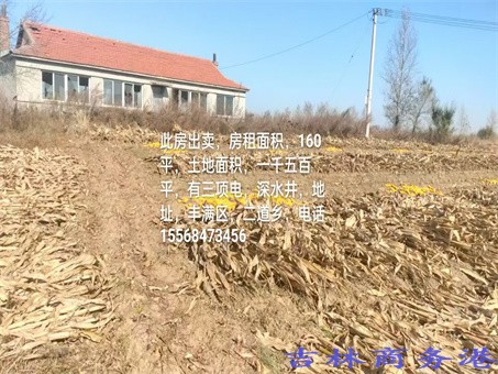 平房院落土地出售 位于吉林省吉林市丰满区二道乡铁西村,占地面积 2000 平,建设用地,房屋面积 160平方米可办房照,深水井动力电,可做养殖业,小型加工厂等独门独院环境好,自然环境优美、空气清新,交通十分便利开车15分钟就能到市区,低价出售,具体详情面议,可实地考察。联系电话 15568473456
